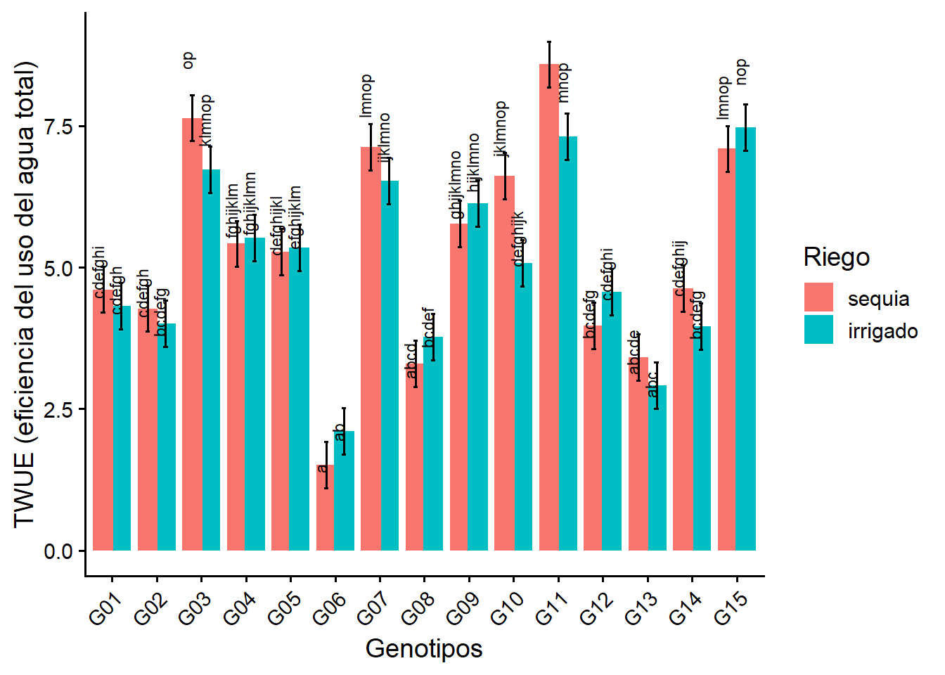 ggplot(letras_df, aes(x = geno, y = emmean, fill = riego)) +geom_col(position =position_dodge(width =0.8)) +geom_errorbar(aes(ymin = emmean - SE, ymax = emmean + SE),width =0.2, position =position_dodge(width =0.8)) +geom_text(aes(label = .group, y = emmean + SE +0.05),position =position_dodge(width =0.8),size =3, vjust =0, angle =90) +labs(x ="Genotipos", y ="TWUE (eficiencia del uso del agua total)",fill ="Riego") +theme_classic(base_size =14) +theme(axis.text.x =element_text(angle =45, hjust =1))