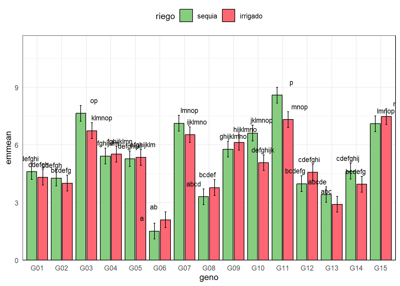 # Medias ajustadas para la interacción riego:genoemm <-emmeans(md, ~ riego:geno)# Comparación de medias con ajuste de Tukeycomp <-pairs(emm, adjust ="tukey")# Generación de letras de significancialetras <- multcomp::cld(emm, adjust ="tukey", Letters = letters)